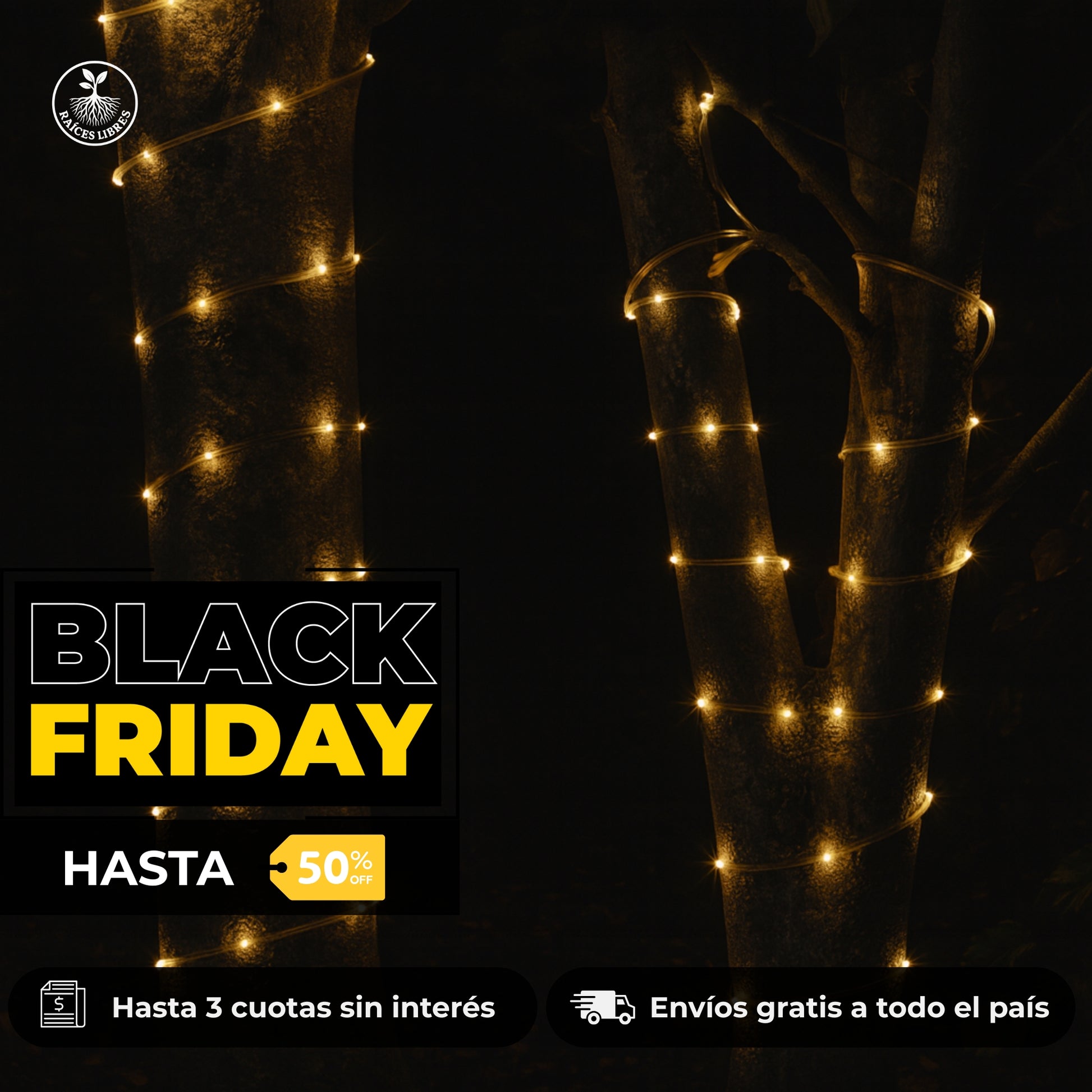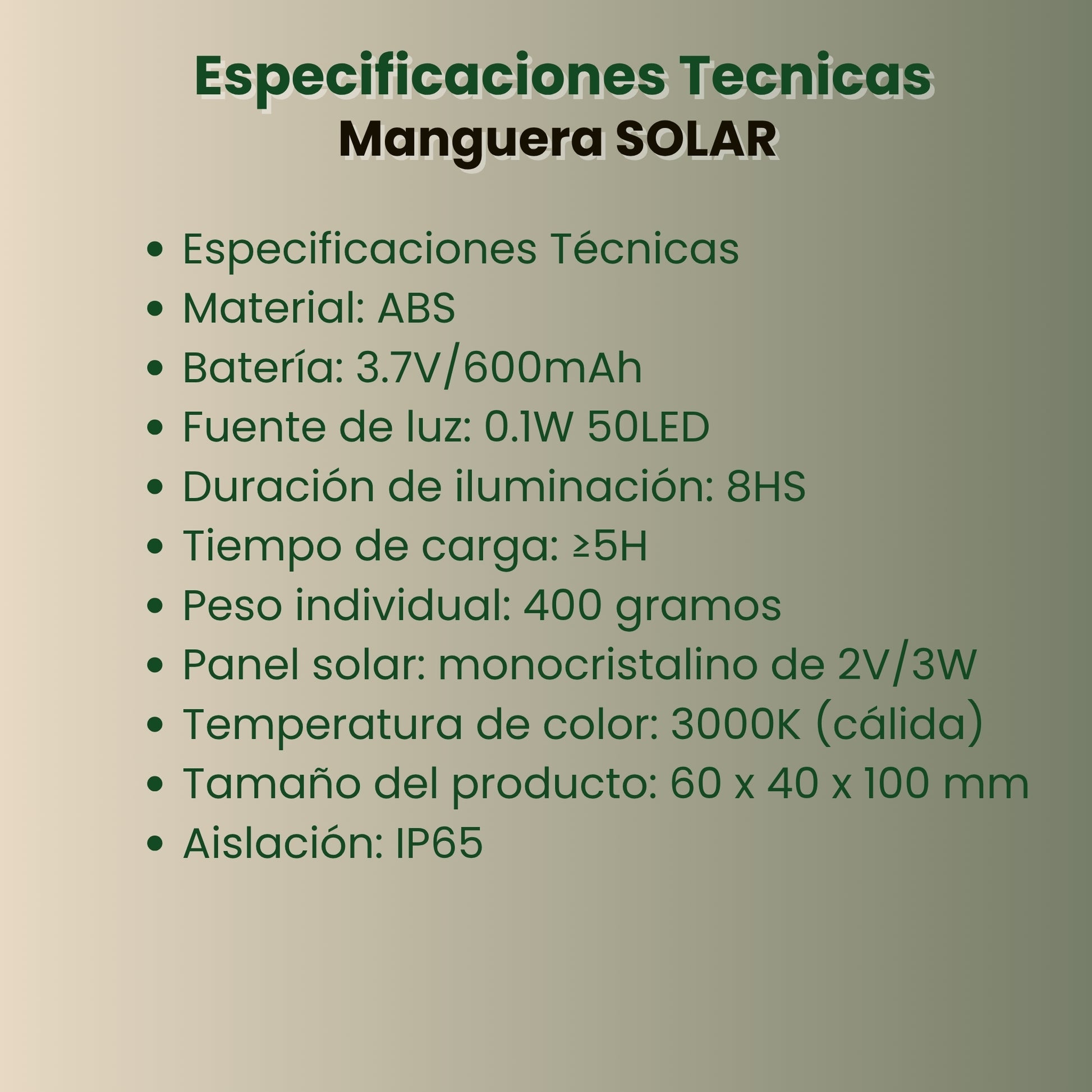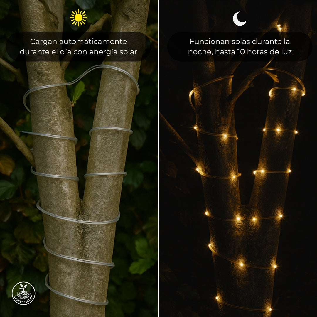 Las manguera Solar de Raíces Libres, se carga con el sol y se encienden solas al anochecer, llenando tu espacio con una luz cálida y natural —como un pequeño ritual que marca el fin del día.